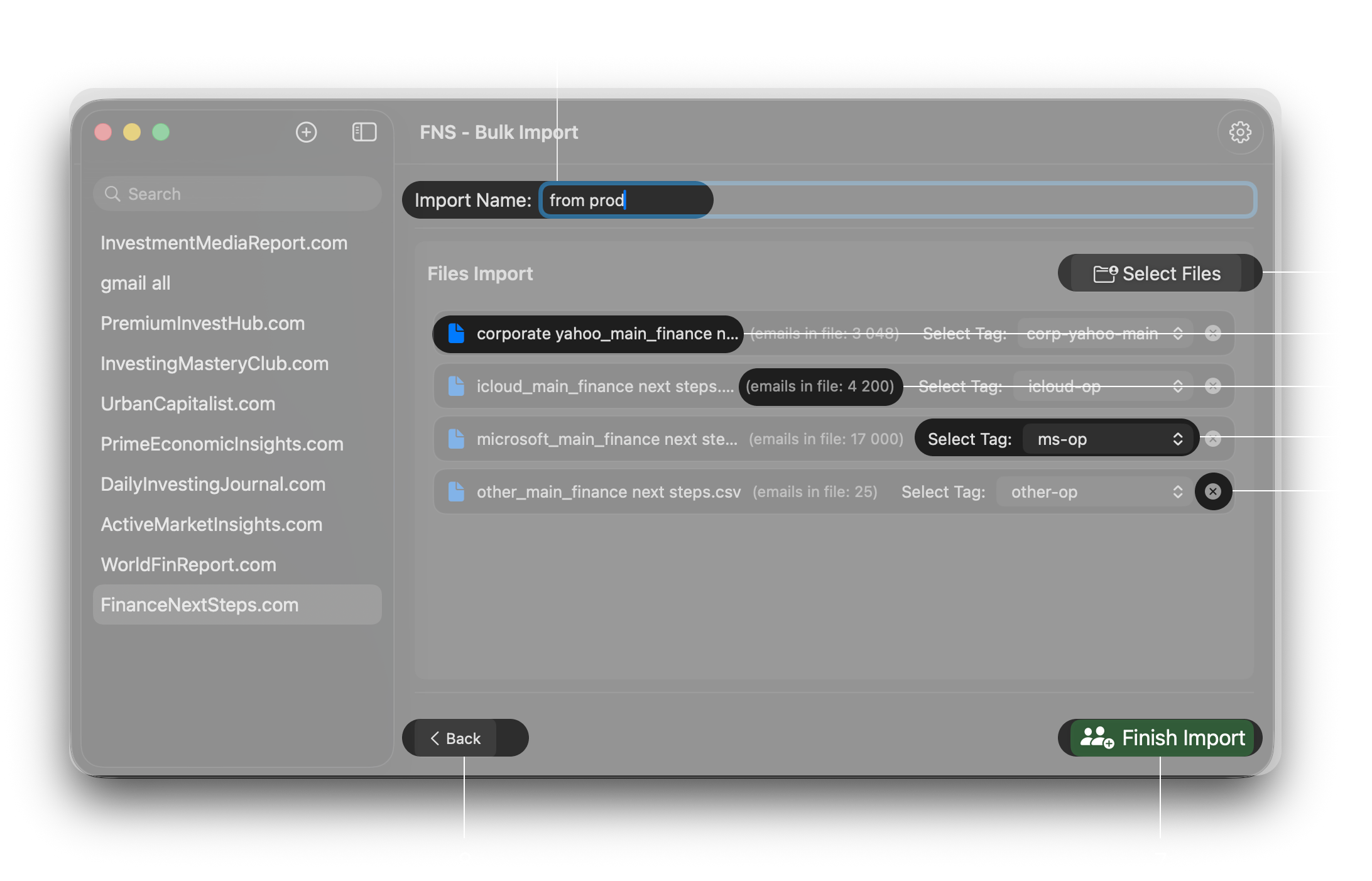 - Upload emails from files to different tags at once