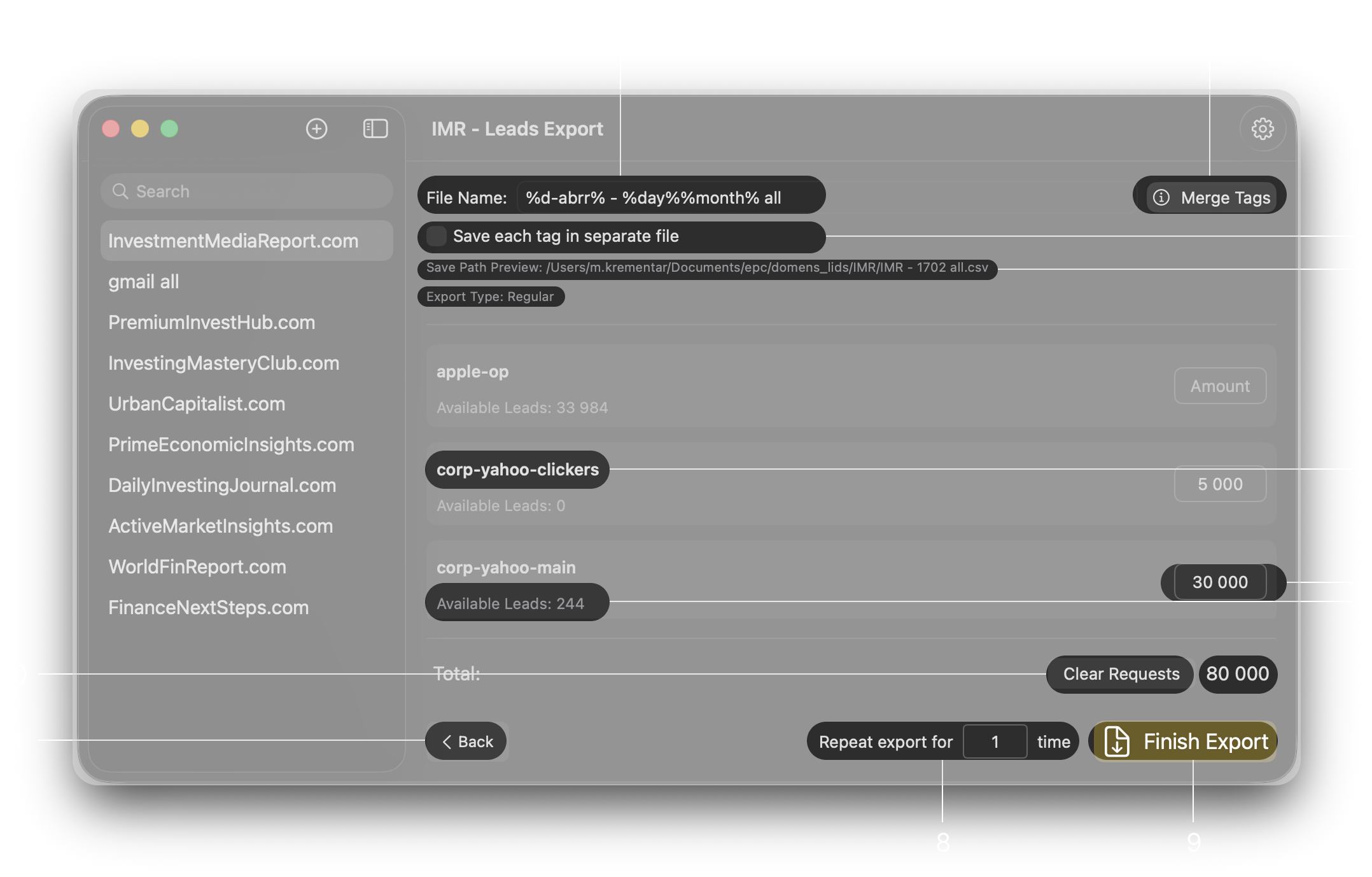 - Type the amount of each tag you want in your export (leave tags you don't need empty)