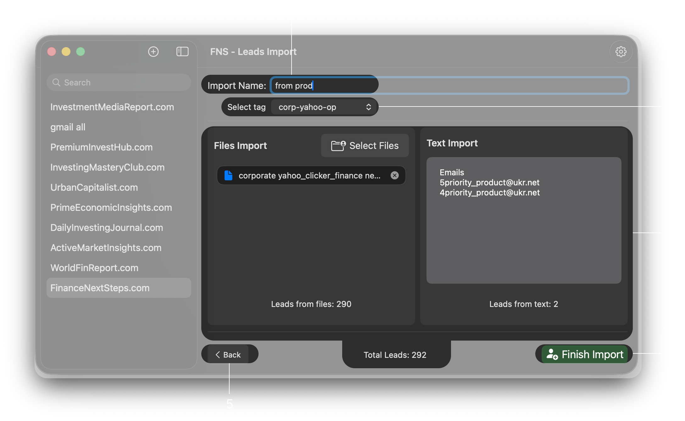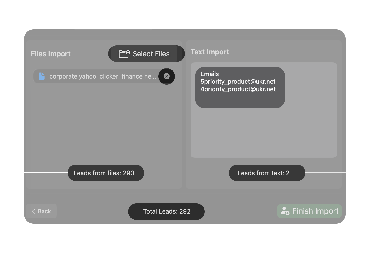 - Import emails from files or from text (don't forget to add the